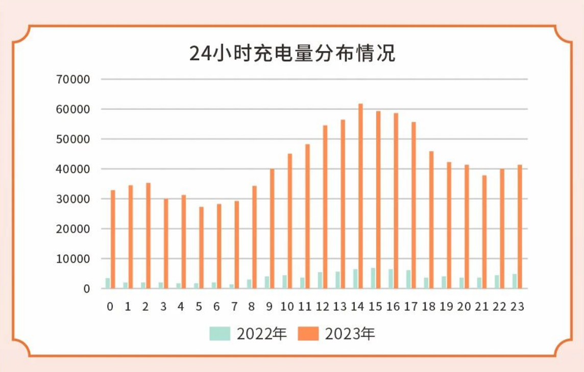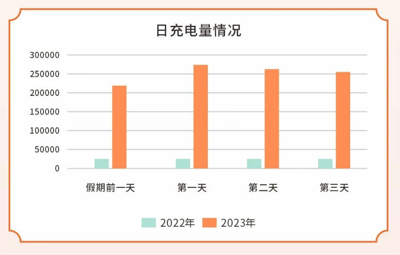 中秋假期期间,出行人流和车流会持续加大,交通出行量将呈现较为集中爆发的态势。根据近两年中秋期间高速日充电量情况预测,今年假期前一天、第一天和最后一天将为高速出行充电高峰期。2022生及2023年中秋期间日充电量情况如下图。