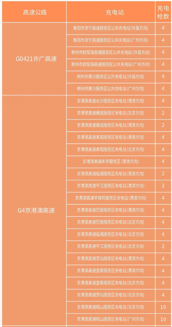 许广高速共有衡阳常宁、郴州欧阳海、黄沙三个服务区6座充电站24把充电枪。