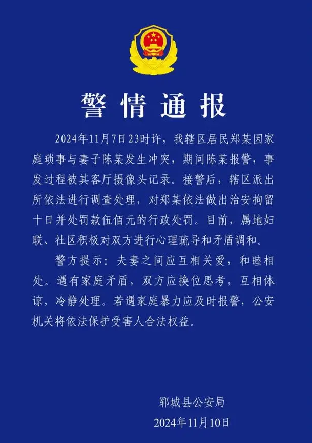 11月10日,郓城县公安局发布警情通报:2024年11月7日23时许,我辖区居民郑某因家庭琐事与妻子陈某发生冲突,期间陈某报警,事发过程被其客厅摄像头记录。
