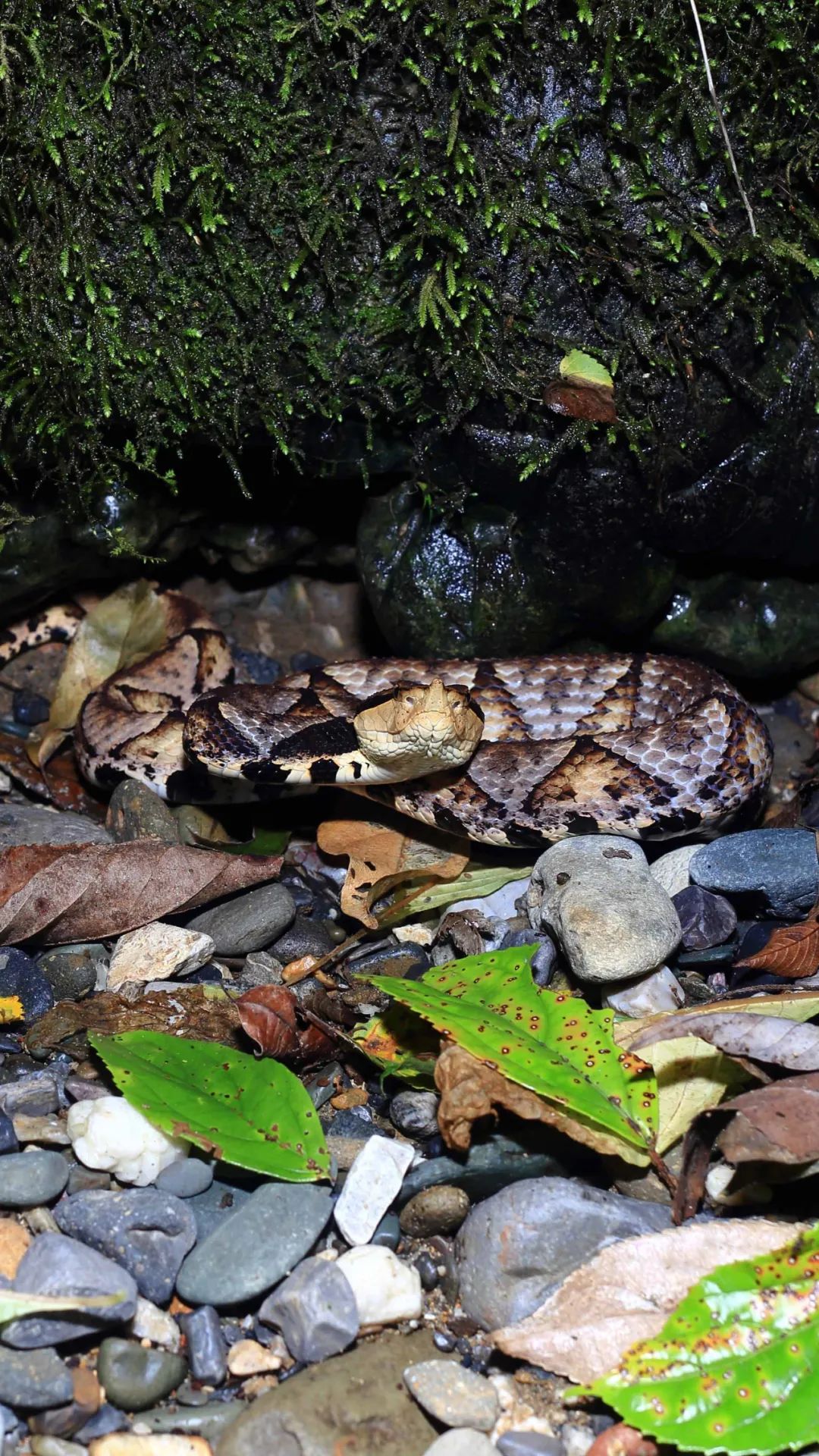 作为永州人,我也一度认为是永州常见的银环蛇或者眼镜蛇,但现在更多的人认为是尖吻蝮。尖吻蝮吻尖向上翘,故而得名。永州民间多称五步蛇,传言被咬伤走五步即死,可见毒性之烈。尖吻蝮长栖岩石上和落叶多的树丛、杂草地、沟边、路旁、茶山、稻田及菜地,其洞穴多在山区树根旁。多在阴雨天活动,气温低时冬眠,气温高时不动,主打一个佛系。主要以蛙、鸟、蟾蜍、蜥蜴等为食。
