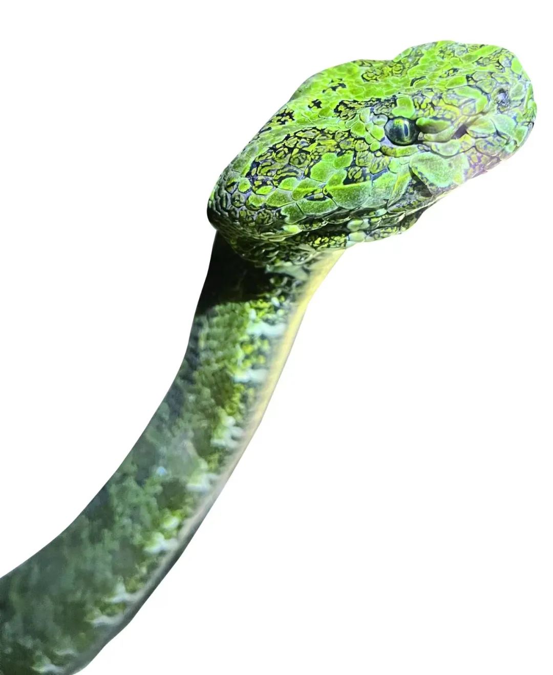 “小青龙”,名副其实,颜值很高。成年蛇体长至少2米,重在3千克以上,已捕获的最重者达17.75千克,属于巨型毒蛇。通身黑褐色,其间杂以极小黄绿色或铁锈色点,构成细的网纹印象;背鳞的一部分为黄绿色,成团聚集,形成地衣状斑,与黑褐色等距相间,纵贯体尾;左右地衣状斑在背中线相接,形成完整横纹或前后略交错。珍贵的莽山烙铁头之所以很难被发现,除了它有很强的领地意识和隐蔽性,还有一个更重要原因——懒,据野生动物保护者的跟踪调查,莽山烙铁头有时三个月的移动距离只有100米左右。