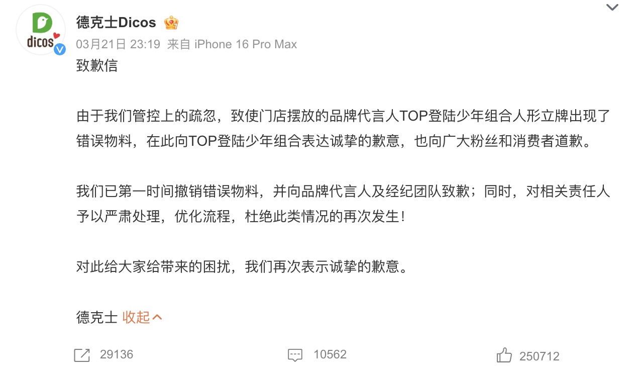 由于我们管控上的疏忽,致使门店摆放的品牌代言人TOP登陆少年组合人形立牌出现了错误物料,在此向TOP登陆少年组合表达诚挚的歉意,也向广大粉丝和消费者道歉。