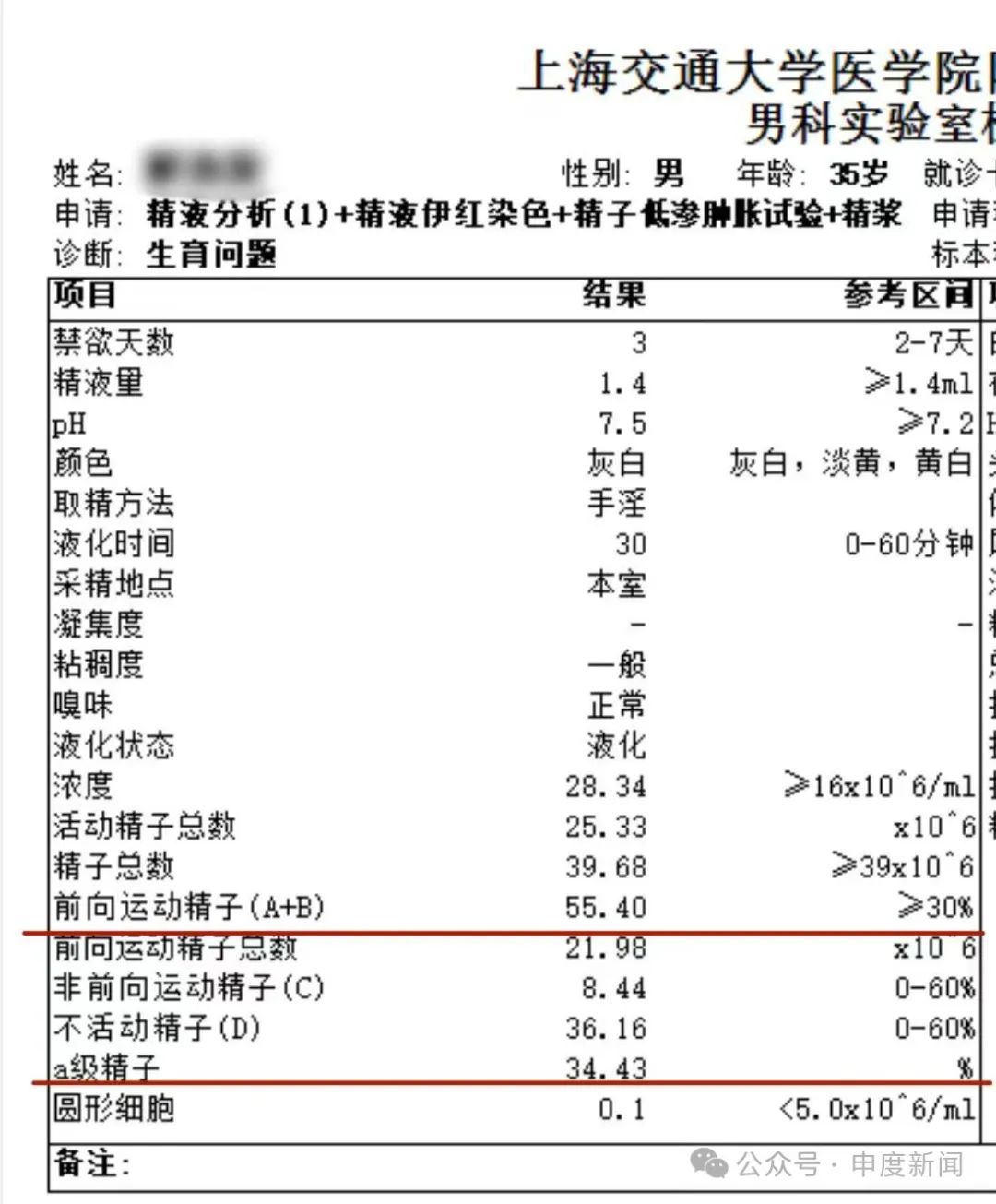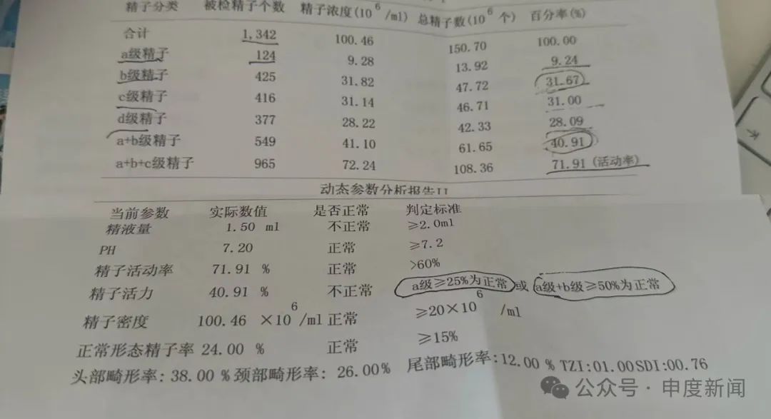 仁济医院的报告单显示,马晨的a级精子占比34.43%,a+b精子占比55.4%,c级精子占比8.44%,d级精子36.16%。