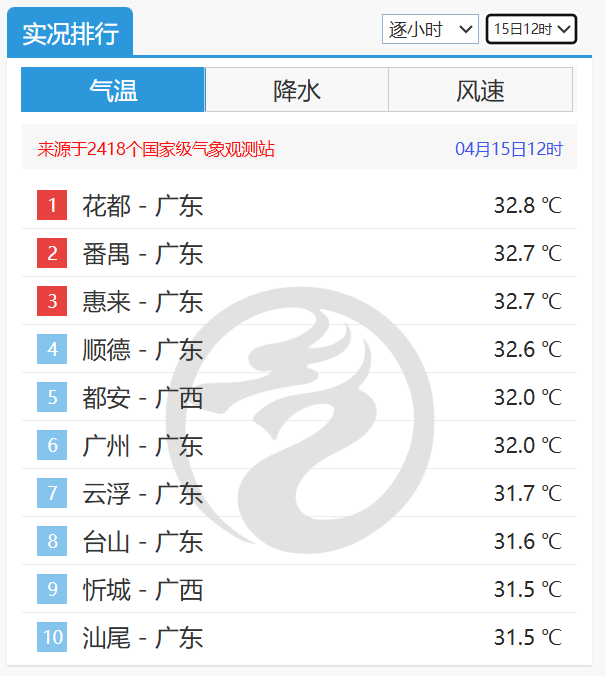 15日上午,广东多地挤进全国气温前十,其中在15日12时,全国前十中广东就占了8个,花都以32.8℃排在全国第一。