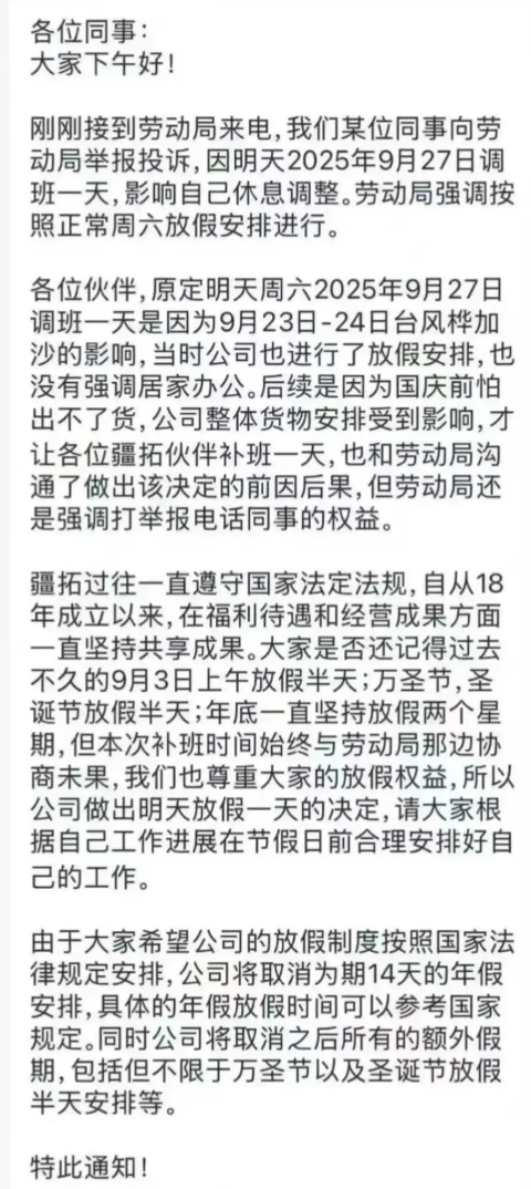 通知中表示,某位同事向劳动局举报投诉,因明天2025年9月27日调班一天,影响自己休息调整。经和劳动局沟通,劳动局要求公司按照正常周六放假安排进行。