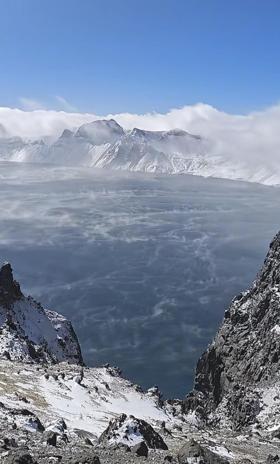 网友拍摄的视频显示,吉林长白山天池的湖面上出现白色蒸腾的雾气,在大风吹拂下,白色雾气在湖面上盘旋环绕。极目新闻记者注意到,天池主峰山坡覆盖着白雪,伴随着主峰上方大片移动的云雾,景色壮观震撼、如梦如幻。