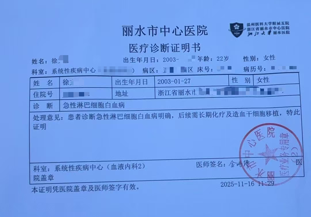近日,浙江公厕殴打案受害人徐女士在网上发文求助称,自己被医院诊断为急性淋巴细胞白血病,面对高昂医疗费,家庭无力承担,遂向网友发起求助。