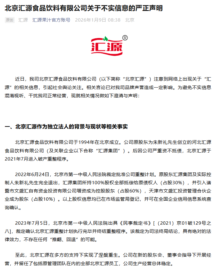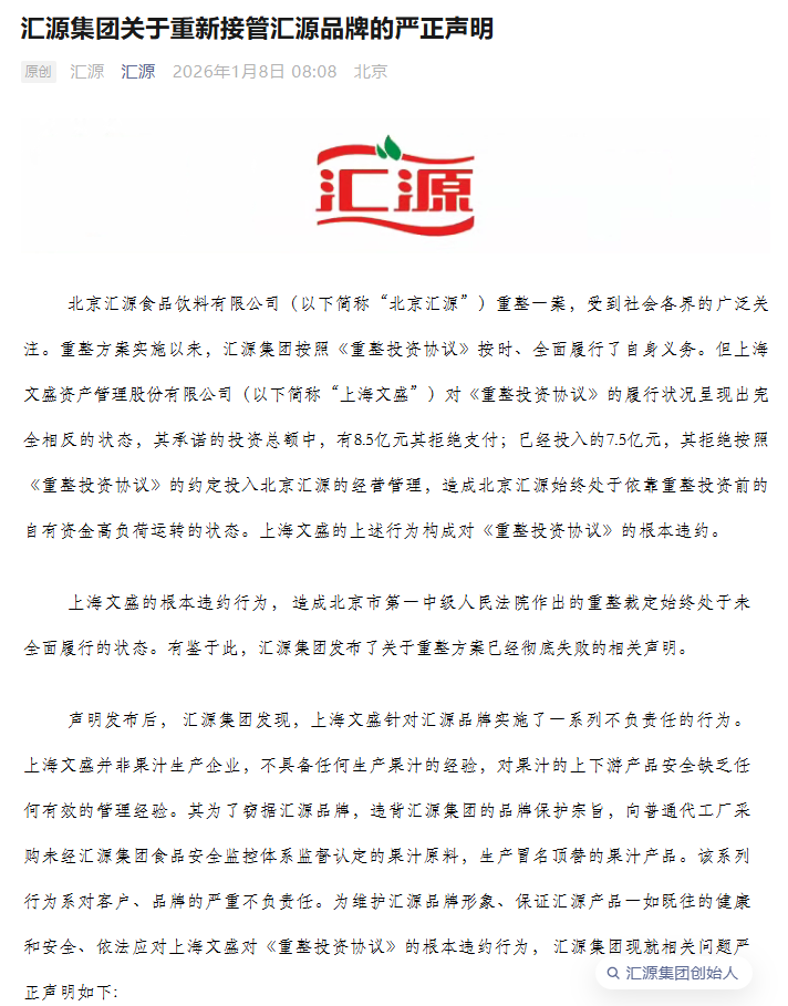 2026年1月8日,汇源集团通过官方渠道发布了一份措辞激烈的《关于重新接管汇源品牌的严正声明》。