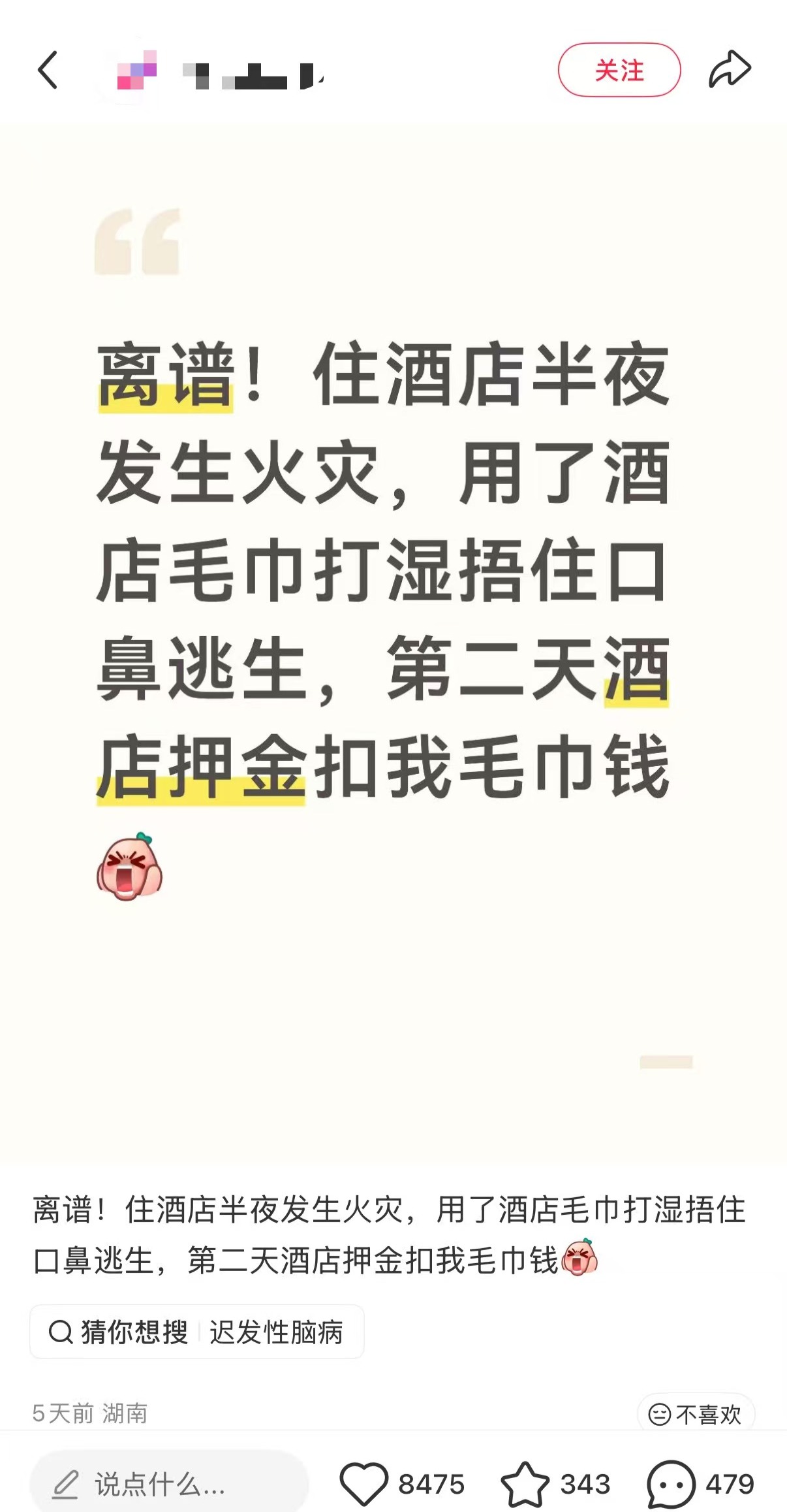 近日,有网友发帖称,住酒店半夜起火,使用酒店毛巾打湿捂住口鼻逃生,次日押金被扣12元毛巾钱。
