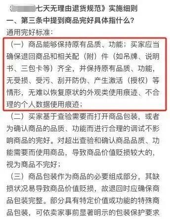 据央视网此前报道,北京市中闻律师事务所合伙人王维维律师认为,根据消费者权益保护法第二十五条的规定,网购服装属于适用七天无理由退货的商品,但适用的条件为退货商品应当保证完好。《网络购买商品七日无理由退货暂行办法》对商品完好的含义进行了进一步明确。该办法规定,商品能够保持原有品质、功能,商品本身、配件、商标标识齐全的,视为商品完好。消费者基于查验需要而打开商品包装,或者为确认商品的品质、功能而进行合理的调试不影响商品的完好。