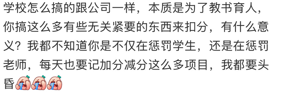 还有网友认为,考核制度名目繁多令人窒息,“天天考虑这么多怎么用心学习”,仅看考核表,苏先生弟弟没有重大过错,劝退处理过于苛刻。网友劝苏先生不要着急,转学或许对弟弟是好事。